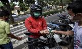Warga menyemprotkan cairan disinfektan kepada pendatang yang akan memasuki wilayah karantina mandiri di Jalan Lebak, Kebonwaru, Kota Bandung, Senin (13/4). Karantina wilayah mandiri yang dilakukan di beberapa wilayah Kota Bandung tersebut bertujuan untuk membatasi interaksi sosial sebagai bagian dari physical distancing guna meminimalisir penyebaran virus Corona (Covid-19) di Kota Bandung (FOTO : ABDAN SYAKURA/REPUBLIKA)