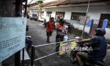 Warga melintas di depan gang yang ditutup di Jalan Lebak, Kebonwaru, Kota Bandung, Senin (13/4). Karantina wilayah mandiri yang dilakukan di beberapa wilayah Kota Bandung tersebut bertujuan untuk membatasi interaksi sosial sebagai bagian dari physical distancing guna meminimalisir penyebaran virus Corona (Covid-19) di Kota Bandung (FOTO : ABDAN SYAKURA/REPUBLIKA)