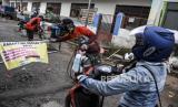 Sejumlah warga menyemprotkan cairan disinfektan kepada pendatang yang akan memasuki wilayah karantina mandiri di Jalan Lebak, Kebonwaru, Kota Bandung, Senin (13/4). Karantina wilayah mandiri yang dilakukan di beberapa wilayah Kota Bandung tersebut bertujuan untuk membatasi interaksi sosial sebagai bagian dari physical distancing guna meminimalisir penyebaran virus Corona (Covid-19) di Kota Bandung (FOTO : ABDAN SYAKURA/REPUBLIKA)