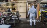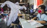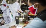 Penjahit memproduksi alat pelindung diri (APD) untuk tenaga medis di Bandung, Jawa Barat, Senin (13/4/2020). Penjahit spesialis seragam dinas dan jaket ini mengalihkan produksinya ke pembuatan APD untuk tenaga medis dalam penanganan pasien COVID-19 di sejumlah rumah sakit umum dan swasta di Jawa Barat dengan jumlah produksi 300 hingga 400 buah per minggu (FOTO : ANTARA FOTO)