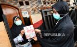 Warga menunjukan bantuan paket perlengkapan Perilaku Hidup Bersih dan Sehat (PHBS) dari Palang Merah Indonesia (PMI) di kawasan Cempaka Putih Barat, Jakarta, Senin (13/4/2020). PMI Pusat secara bertahap akan membagikan 500 ribu bantuan paket PHBS dan melakukan penyemprotan disinfektan untuk membantu masyarakat yang terdampak COVID-19 agar bisa menerapkan hidup bersih dan sehat selama pandemi (FOTO : Antara/M Risyal Hidayat)
