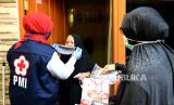 REPUBLIKA.CO.ID, JAKARTA -- Petugas Palang Merah Indonesia (PMI) memakaikan masker kepada warga yang merupakan bagian dari bantuan paket perlengkapan Perilaku Hidup Bersih dan Sehat (PHBS) di kawasan Cempaka Putih Barat, Jakarta, Senin (13/4/2020).