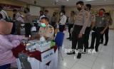 REPUBLIKA.CO.ID, SERANG -- Sejumlah personel Polda Banten antre melakukan pemeriksaan kesehatan sebelum mendonorkan darahnya di Mapolda Banten, di Serang, Banten, Senin (13/4/2020).