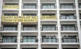 Sejumlah spanduk bertuliskan penolakan atas penggunaan rumah sakit darurat COVID-19 terpasang di Lippo Plaza, Mampang, Jakarta, Ahad (5/4/2020). Aksi tersebut sebagai bentuk kekhawatiran penghuni apartemen Nine Residence yang membuat mereka berada dalam zona merah COVID-19 (FOTO : ANTARA/M Risyal Hidayat)