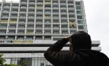 Warga mengamati spanduk bertuliskan penolakan atas penggunaan rumah sakit darurat COVID-19 yang terpasang di Lippo Plasa, Mampang, Jakarta, Ahad (5/4/2020). Aksi tersebut sebagai bentuk kekhawatiran penghuni apartemen Nine Residence yang membuat mereka berada dalam zona merah COVID-19. (FOTO : ANTARA/M Risyal Hidayat)