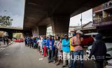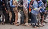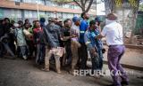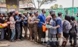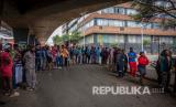 REPUBLIKA.CO.ID, JOHANNESBURG -- Sejumlah tunawisma berpegangan satu sama lain ketika antri menunggu makanan dibagikan di Pasar Mai Mai saat di diberlakukannya lockdown hari ke-18, Johannesburg, Afrika Selatan, Senin (13/4).