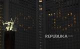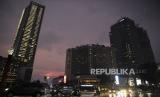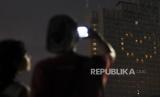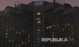REPUBLIKA.CO.ID, JAKARTA -- Hotel Grand Hyatt menyalakan lampu-lampu kamarnya membentuk lambang hati di kawasan Bundaran HI, jakarta, Senin (13/4/2020).