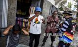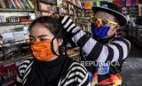 Anggota Badut Nyentrik Cimahi Bandung Sauyunan (Necis) memasangkan masker kepada karyawan di salah satu toko di kawasan Alun-alun Cimahi, Kota Cimahi, Selasa (14/4). Komunitas Badut Necis membagikan 2020 masker kain secara gratis kepada pengendara, sopir, pedagang serta masyarakat yang memerlukan sebagai salah satu bentuk keprihatinan sekaligus berpartisipasi dalam upaya meminimalisir penyebaran virus Corona (Covid-19) (FOTO : ABDAN SYAKURA/REPUBLIKA)