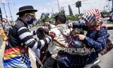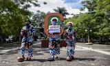 Sejumlah anggota Badut Nyentrik Cimahi Bandung Sauyunan (Necis) berjalan saat membagikan masker kain di kawasan Alun-alun Cimahi, Kota Cimahi, Selasa (14/4). Komunitas Badut Necis membagikan 2020 masker kain secara gratis kepada pengendara, sopir, pedagang serta masyarakat yang memerlukan sebagai salah satu bentuk keprihatinan sekaligus berpartisipasi dalam upaya meminimalisir penyebaran virus Corona (Covid-19) (FOTO : ABDAN SYAKURA/REPUBLIKA)