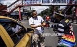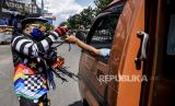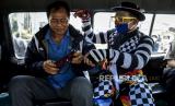 Anggota Badut Nyentrik Cimahi Bandung Sauyunan (Necis) membagikan masker kain gratis kepada penumpang angkot di Jalan Raya Simpang, Padalarang, Kabupaten Bandung Barat, Selasa (14/4). Komunitas Badut Necis membagikan 2020 masker kain secara gratis kepada pengendara, sopir, pedagang serta masyarakat yang memerlukan sebagai salah satu bentuk keprihatinan sekaligus berpartisipasi dalam upaya meminimalisir penyebaran virus Corona (Covid-19) (FOTO : ABDAN SYAKURA/REPUBLIKA)