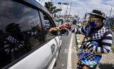 Anggota Badut Nyentrik Cimahi Bandung Sauyunan (Necis) membagikan masker kain gratis kepada pengendara motor di Jalan Raya Simpang, Padalarang, Kabupaten Bandung Barat, Selasa (14/4). Komunitas Badut Necis membagikan 2020 masker kain secara gratis kepada pengendara, sopir, pedagang serta masyarakat yang memerlukan sebagai salah satu bentuk keprihatinan sekaligus berpartisipasi dalam upaya meminimalisir penyebaran virus Corona (Covid-19) (FOTO : ABDAN SYAKURA/REPUBLIKA)