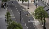 Seorang pengendara sepeda sendirian di Oxford Street yang sepi, London Pusat, Inggris, Senin (13/4). Inggris akan memperpanjang lockdown hingga 7 Mei nanti. Data setempat menunjukkan 11 ribu lebih warga Inggris meninggal akibat Covid-19. (FOTO : EPA)