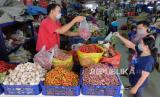 Pedagang bumbu dapur melayani pembeli di Pasar Badung, Denpasar, Bali, Selasa (14/4/2020). Pengelola pasar di 16 lokasi pasar tradisional di Denpasar akan memberikan keringanan biaya sewa los 50 persen bagi tiap pedagang mulai 12 April hingga 29 Mei 2020 karena lesunya perekonomian akibat wabah COVID-19 (FOTO : Antara/Nyoman Hendra Wibowo)