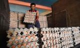 Pekerja menurunkan telur dari truk di Jalan Kabupaten, Pamekasan, Jawa Timur, Selasa (14/4/2020). Menjelang bulan Ramadhan harga telur broiler di daerah itu tetap stabil dikisaran Rp22 (FOTO : ANTARA/Saiful Bahri)