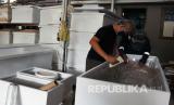 Pekerja melapisi peti jenazah khusus untuk korbanCOVID-19 yang sudah selesai dibuat dengan plastik tebal di rumah industri pembuatan peti mati Gate Way Funeral Service Serpong, Tangerang Selatan, Banten, Selasa (14/4/2020). Industri rumahan tersebut terus kebanjiran permintaan peti jenazah dengan standart COVID-19 dari berbagai Rumah Sakit rujukan COVID-19 di Jakarta, Tangerang dan luar Jakarta, dalam satu hari mampu memproduksi sepeuluh peti jenazah. (FOTO : Antara/Muhammad Iqbal)