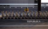 Seorang pekerja mengumpulkan troli bagasi di area tiket yang kosong di Bandara Internasional Narita di Narita, Tokyo, Rabu (1/4). AP Foto / Jae C (FOTO : AP / Jae C. Hong)