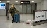Seorang turis yang mengenakan ponco dan kacamata berjalan melalui area kedatangan di Bandara Internasional Narita di Narita, Tokyo, Kamis (2/4). AP Foto / Jae C (FOTO : AP / Jae C. Hong)