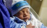 Bayi memakai Face Shield di RSIA Tambak, Jakarta, Selasa (14/4/2020). Untuk mencegah penyebaran COVID-19, pihak rumah sakit memberikan Face Shield atau penutup muka pada bayi yang baru lahir. (FOTO : Rivan Awal Lingga/ANTARA FOTO)