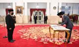 Presiden Joko Widodo (kanan) menyaksikan Kepala Badan Pelindungan Pekerja Migran Indonesia (BP2MI) Benny Rhamdani menandatangani berkas pelantikan di Istana Negara, Jakarta, Rabu (15/4/2020). Presiden Joko Widodo resmi melantik Benny Rhamdani menjadi Kepala BP2MI. (FOTO : Antara/Hafidz Mubarak A)