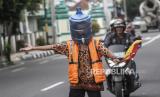 Ali Akbar (52) Sukarelawan Pengatur Lalu Lintas (Supeltas) mengatur lalu lintas mengenakan pelindung wajah dari galon bekas di Jalan Tamansiswa, DI Yogyakarta, Rabu (15/4/2020). Ali Akbar menggunakan pelindung wajah unik itu saat mengatur lalu lintas guna mengantisipasi penularan COVID-19 (FOTO : Antara/Hendra Nurdiyansyah)