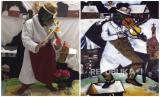 Foto kombo salinan dari karya seni Green Fiddle Player karya Marc Chagall (kanan) dan rekreasi Galina Vishnevskaya untuk halaman Facebook Izoizolyacia di Moskow, Rusia, Selasa (7/4). (FOTO : Galina Vishnevskaya via AP )