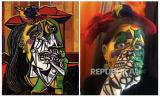 Foto kombo salinan karya seni Crying Woman dari Pablo Picasso (kiri) dan kreasi Katrusya Kosilkova untuk halaman Facebook Izoizolyacia di Kyiv, Ukraina, Kamis (9/4). (FOTO : Katrusya Kosilkova via AP )