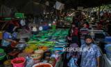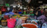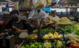 Pedagang melayani pembeli di Pasar Minggu, Jakarta, Kamis (16/4). Menurut pedagang setempat sejak diberlakukannya Pembatasan Sosial Berskala Besar (PSBB), pasar tersebut menjadi sepi pembeli dan mengakibatkan omzet penjualan menurun hingga 80 persen (FOTO : ANTARA/Galih Pradipta)