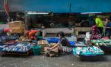 Pedagang menunggu pembeli di Pasar Minggu, Jakarta, Kamis (16/4). Menurut pedagang setempat sejak diberlakukannya Pembatasan Sosial Berskala Besar (PSBB), pasar tersebut menjadi sepi pembeli dan mengakibatkan omzet penjualan menurun hingga 80 persen (FOTO : ANTARA/Galih Pradipta)