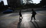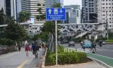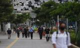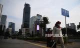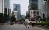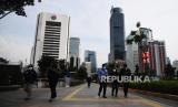 REPUBLIKA.CO.ID, JAKARTA -- Sejumlah pekerja berjalan usai bekerja dengan latar belakang gedung perkantoran di Jalan Jenderal Sudirman, Jakarta, Kamis (16/4/2020).