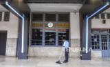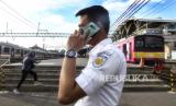 Petugas Kereta Api berkomunikasi dengan ponselnya di Stasiun Manggarai yang sepi di Jakarta, Senin (6/4/2020) pukul 07.19 WIB (FOTO : ANTARA FOTO/MUHAMMAD ADIMAJA)