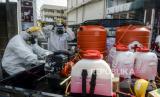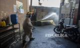 Petugas Palang Merah Indonesia (PMI) menyemprotkan cairan disinfektan di pemukiman padat penduduk di kawasan Petamburan, Jakarta, Jumat (17/4). Penyemprotan cairan disinfektan di lingkungan pemukiman padat penduduk yang lokasinya berdekatan dengan asrama Sekolah Tinggi Teknologi (STT) Bethel itu dilakukan setelah 34 mahasiswa terkonfirmasi positif virus Corona (COVID-19) (FOTO : Republika/Putra M. Akbar)