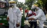 Petugas Palang Merah Indonesia (PMI) beristirahat disela penyemprotan cairan disinfektan di pemukiman padat penduduk di kawasan Petamburan, Jakarta, Jumat (17/4). Penyemprotan cairan disinfektan di lingkungan pemukiman padat penduduk yang lokasinya berdekatan dengan asrama Sekolah Tinggi Teknologi (STT) Bethel itu dilakukan setelah 34 mahasiswa terkonfirmasi positif virus Corona (COVID-19) (FOTO : Republika/Putra M. Akbar)