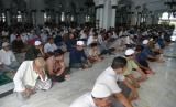 Umat muslim mendengarkan khotbah sebelum pelaksanaan shalat Jumat di Masjid Raya Baiturrahman, Banda Aceh, Aceh, Jumat (17/4). Pelaksanaan shalat Jumat di Masjid Raya Baiturrahman itu tidak lagi menerapkan pembatasan jarak (physical distancing) dan hanya sebagian yang mengenakan masker. (FOTO : ANTARA/Ampelsa)