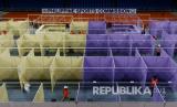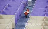 Seorang pekerja membersihkan ruang perawat yang didirikan di lantai bermain PhilSports Arena di Pasig City, Metro Manila, Filipina,Jumat (17/4). Ditengah pandemi koronavirus yang sedang berlangsung, Tempat tersebut diubah menjadi fasilitas karantina untuk merawat pasien COVID-19 dengan kapasitas sekitar 150 tempat tidur (FOTO : EPA-EFE/ROLEX DELA PENA )
