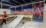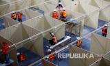 Pekerja mendirikan kamar-kamar tidur di lantai bermain PhilSports Arena di Pasig City, Metro Manila, Filipina, Jumat (17/4). Ditengah pandemi koronavirus yang sedang berlangsung, Tempat tersebut diubah menjadi fasilitas karantina untuk merawat pasien COVID-19 dengan kapasitas sekitar 150 tempat tidur (FOTO : EPA-EFE/ROLEX DELA PENA)