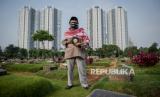 Karyoto (56) jasa pemberi doa berpose di Tempat Pemakaman Umum (TPU) Menteng Pulo, Jakarta, Ahad (19/4). Menjelang bulan suci Ramadan, sejumlah umat muslim melakukan ziarah untuk mendoakan keluarganya yang telah meninggal tanpa menghiraukan imbauan penggunaan masker guna mencegah penyebaran COVID-19 (FOTO : Republika/Thoudy Badai)