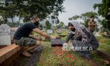 Sejumlah warga berziarah ditengah pandemi COVID-19 di Tempat Pemakaman Umum (TPU) Menteng Pulo, Jakarta, Ahad (19/4). Menjelang bulan suci Ramadan, sejumlah umat muslim melakukan ziarah untuk mendoakan keluarganya yang telah meninggal tanpa menghiraukan imbauan penggunaan masker guna mencegah penyebaran COVID-19 (FOTO : Republika/Thoudy Badai)
