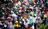 REPUBLIKA.CO.ID, BOGOR -- Ratusan warga mengantre pembagian bahan pokok di Gedung Baznas Kabupaten Bogor, Cibinong, Bogor, Jawa Barat, Senin (20/4). Pembagian 500 paket sembako terdiri dari 5 Kg beras dan 10 mie instan itu untuk meringankan beban warga yang terdampak pandemi COVID-19.