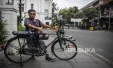 Seorang pengojek sepeda mengangkut penumpang di kawasan Kota Tua, Jakarta, Selasa (21/4/2020). Di tengah pandemi COVID-19, para pengojek sepeda yang menawarkan jasanya mulai Rp5.000 itu mengaku sulit mencari penumpang. (FOTO : Antara/Aprillio Akbar)