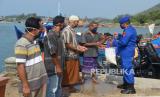 REPUBLIKA.CO.ID, ACEH BESAR -- Direktur Pol Air Polda Aceh Kombes Jemmy Rosdiantoro (kanan) menyerahkan sembako kepada masyarakat nelayan wilayah terluar pulau Beras, Kecamatan Pulau Aceh, Kabupaten Aceh Besar, Aceh Selasa (21/4/2020).