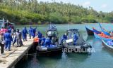 Personel Dit Pol Air Polda Aceh menurunkan sembako saat tiba di dermaga wilayah terluar pulau Beras, Kecamatan Pulau Aceh, Kabupaten Aceh Besar, Aceh Selasa (21/4/2020). Dit Pol Air Polda Aceh mengantarkan langsung bantuan sembako, masker, baju pelampung dan alat tangkap jaring untuk warga pulau terluar itu yang ekonomi mereka terdampak pandemi COVID-19 (FOTO : ANTARA/ampelsa)