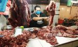 Seorang pedagang memotong daging sapi di Pusat Pasar Medan, Sumatera Utara, Selasa (21/4/2020). Menjelang bulan Ramadhan harga daging sapi di sejumlah pasar di Kota Medan masih normal yakni dengan harga Rp110 ribu per kilogram (FOTO : ANTARA FOTO)