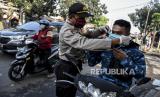 Petugas gabungan memberikan masker kepada pengendara saat penerapan Pembatasan Sosial Berskala Besar (PSBB) di perbatasan Bandung - Cimahi, Jalan Rajawali, Kota Bandung, Rabu (22/4). Pemeriksaan tersebut untuk memastikan setiap pengendara mematuhi aturan Pembatasan Sosial Berskala Besar (PSBB) yang diterapkan di Kota Bandung (FOTO : Republika/Abdan Syakura)