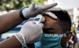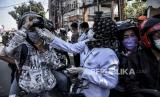 Petugas kesehatan memeriksa suhu tubuh pengendara saat penerapan Pembatasan Sosial Berskala Besar (PSBB) di perbatasan Bandung - Cimahi, Jalan Rajawali, Kota Bandung, Rabu (22/4). Pemeriksaan tersebut untuk memastikan setiap pengendara mematuhi aturan Pembatasan Sosial Berskala Besar (PSBB) yang diterapkan di Kota Bandung (FOTO : Republika/Abdan Syakura)