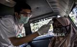 Petugas kesehatan memeriksa suhu tubuh penumpang angkot saat penerapan Pembatasan Sosial Berskala Besar (PSBB) di perbatasan Bandung - Cimahi, Jalan Rajawali, Kota Bandung, Rabu (22/4). Pemeriksaan tersebut untuk memastikan setiap pengendara mematuhi aturan Pembatasan Sosial Berskala Besar (PSBB) yang diterapkan di Kota Bandung (FOTO : Republika/Abdan Syakura)