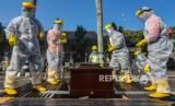 Sejumlah personel Polisi, TNI, dan tenaga medis mengikuti simulasi pemulasaraan dan pemakaman jenazah terduga penderita COVID-19 di Mapolres Ciamis, Jawa Barat, Rabu (22/4/2020). Simulasi pemulasaraan jenazah yang digelar bersama Gugus Tugas Penanganan COVID-19 tersebut dilakukan untuk melatih kemampuan dan kesiapsiagaan petugas (FOTO : ANTARA/adeng bustomi)