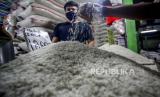 Pedagang menata beras yang dijual di Pasar Cibinong, Bogor, Jawa Barat, Rabu (22/4/2020). Menteri Perdagangan Agus Suparmanto memastikan harga bahan pokok di Indonesia stabil menjelang Ramadhan dan Lebaran 2020 (FOTO : ANTARA/Yulius Satria Wijaya)