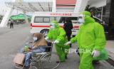 Petugas medis membantu mendorong kursi roda milik seorang warga negara Indonesia (WNI) yang sedang sakit dari Port Dickson Malaysia setibanya di Pelabuhan Internasional PT Pelindo I Dumai di Dumai, Riau, Rabu (22/4/2020). Pelabuhan Internasional Dumai akhirnya dibuka dan menerima kepulangan 162 WNI terdampak karantina (lockdown) pandemi COVID-19 di Malaysia setelah hampir satu bulan lebih pelabuhan internasional tersebut ditutup (FOTO : Antara/Aswaddy Hamid )