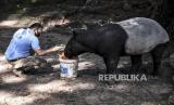 Perawat hewan memberi makan tapir (Tapirus) di Bandung Zoological Garden, Kota Bandung, Kamis (23/4). Bandung Zoological Garden tetap merawat dan memberikan pakan secara rutin kepada hewan koleksi guna menjaga kesehatan selama periode Pembatasan Sosial Berskala Besar (PSBB) Bandung Raya di tengah pandemi Covid-19 (FOTO : Republika/Abdan Syakura)