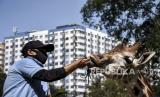 Perawat hewan memberi makan jerapah (Giraffa) di Bandung Zoological Garden, Kota Bandung, Kamis (23/4). Bandung Zoological Garden tetap merawat dan memberikan pakan secara rutin kepada hewan koleksi guna menjaga kesehatan selama periode Pembatasan Sosial Berskala Besar (PSBB) Bandung Raya di tengah pandemi Covid-19 (FOTO : Republika/Abdan Syakura)